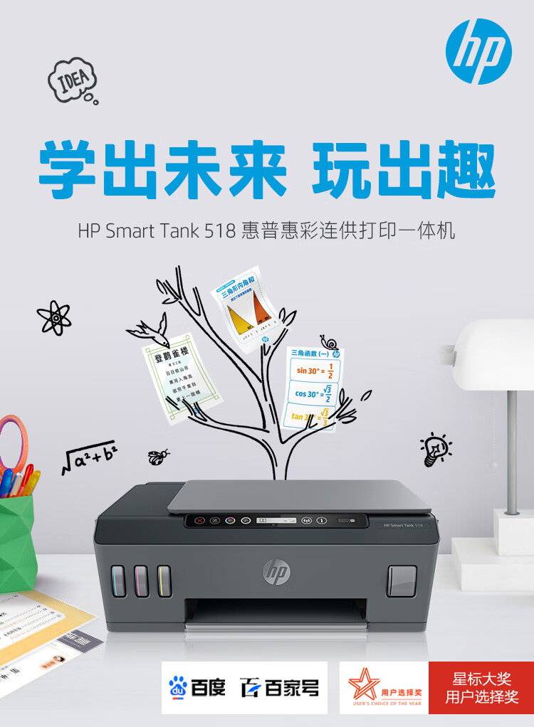 惠普(HP)518连供彩色多功能打印机学生家用喷墨 无线连接 照片打印 单页1分钱大印量可加墨 打印复印扫描