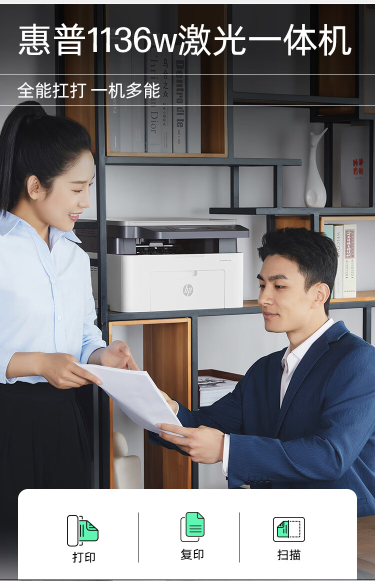 惠普(HP)1136w 黑白激光打印机多功能家用办公打印机 复印扫描无线商用办公(136w升级版)