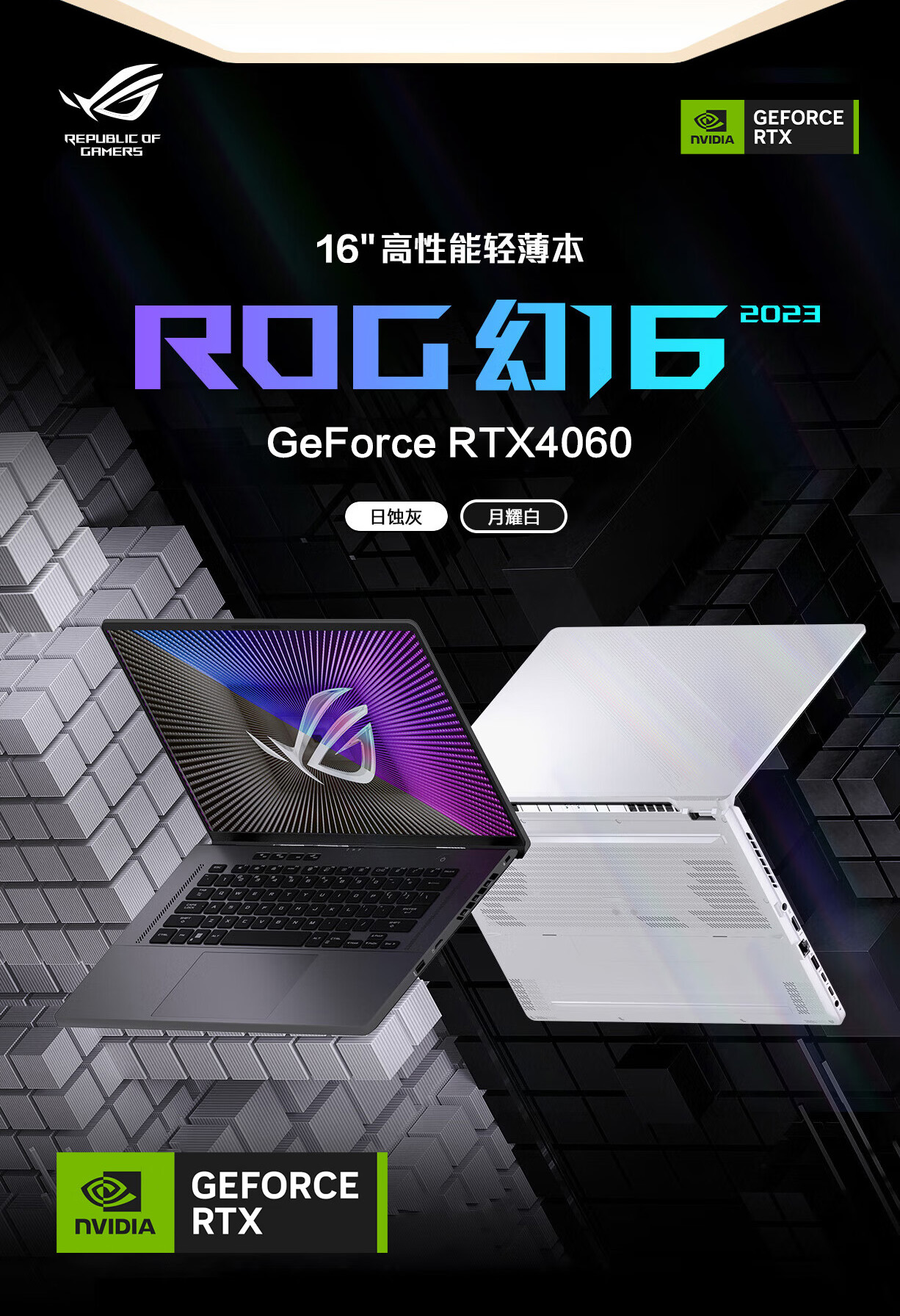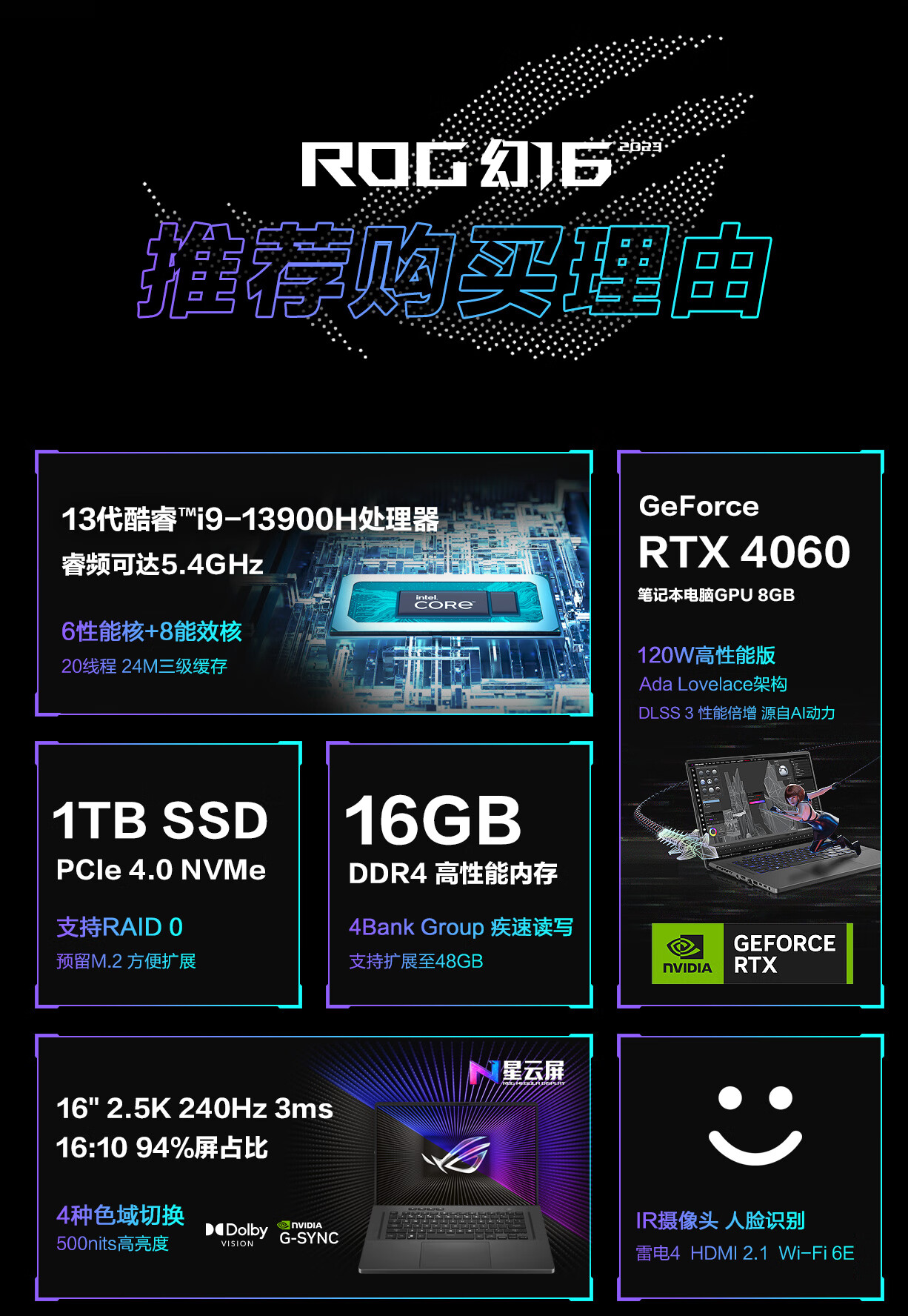 ROG幻16 2023 第13代英特尔酷睿i9 16英寸 星云屏 设计师轻薄高性能游戏本笔记本电脑(i9-13900H 16G 1T RTX4060 2.5K 240Hz P3广色域)灰